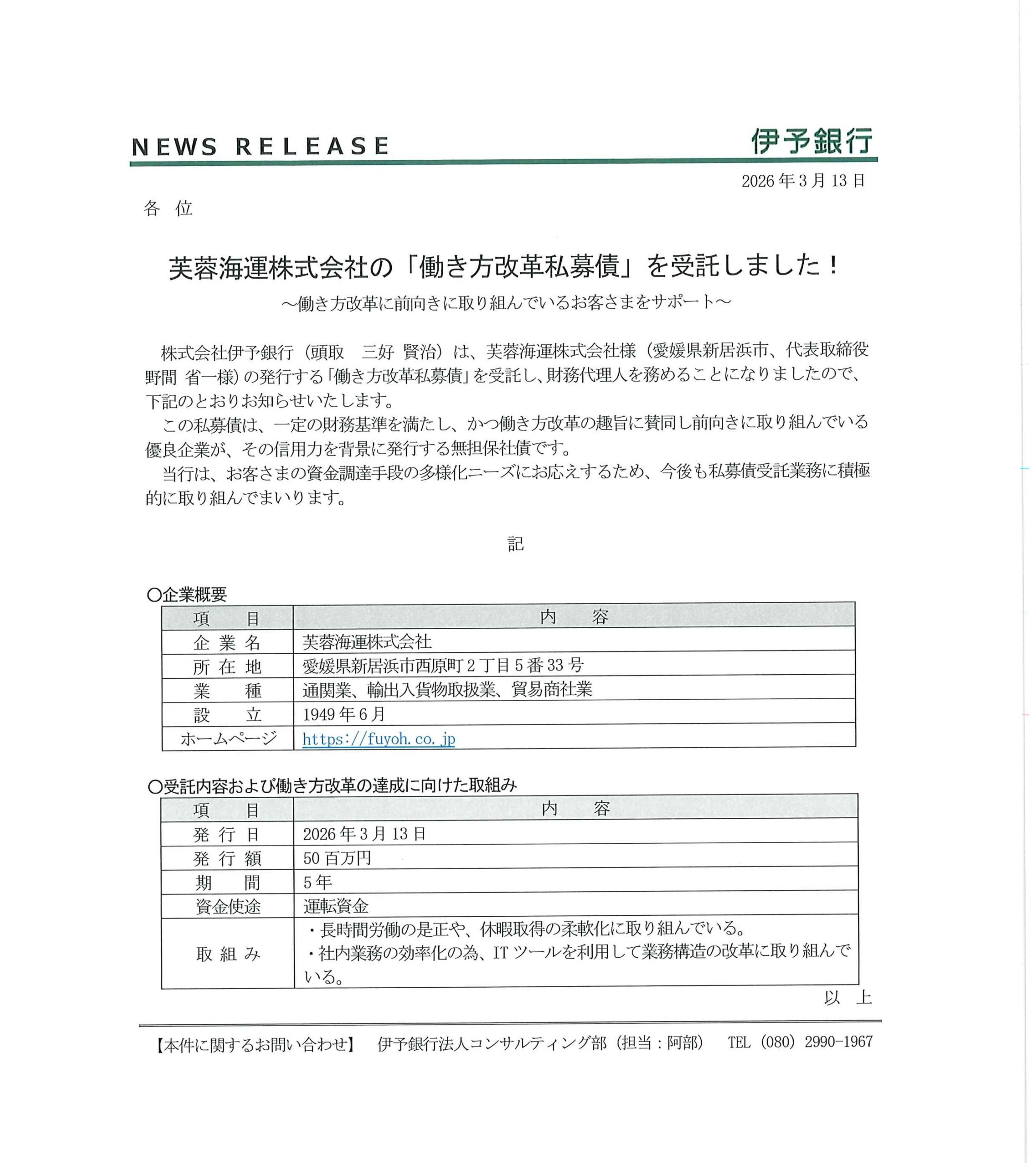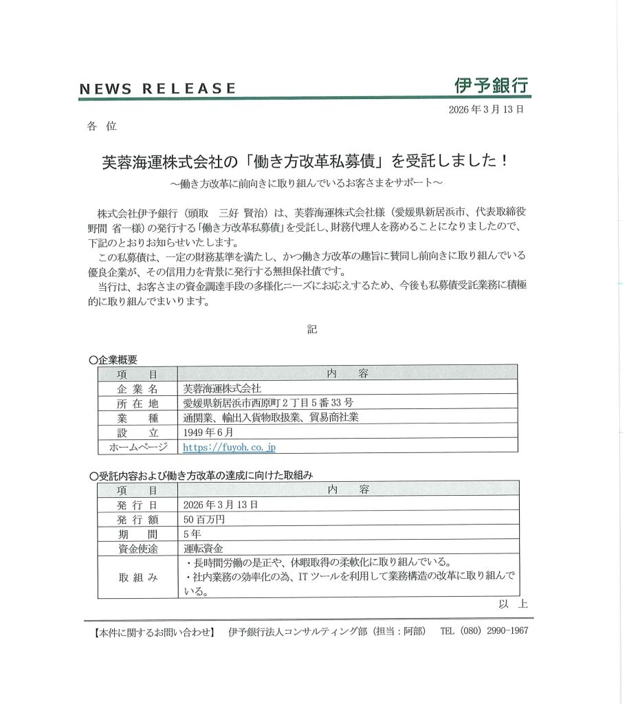 当社は、2026年3月13日付で、株式会社伊予銀行を引受先とする第3回無担保社債 「働き方改革私募債」を発行し5千万円の運転資金を調達しました。 今後もさらなる働き方改革に取り組み、従業員が気持ちよくその持てる力を発揮できる環境を整えることで、安定した労働力を確保し、社会に寄与する事業活動を進めてまいります。 <伊予銀行プレスリリース>